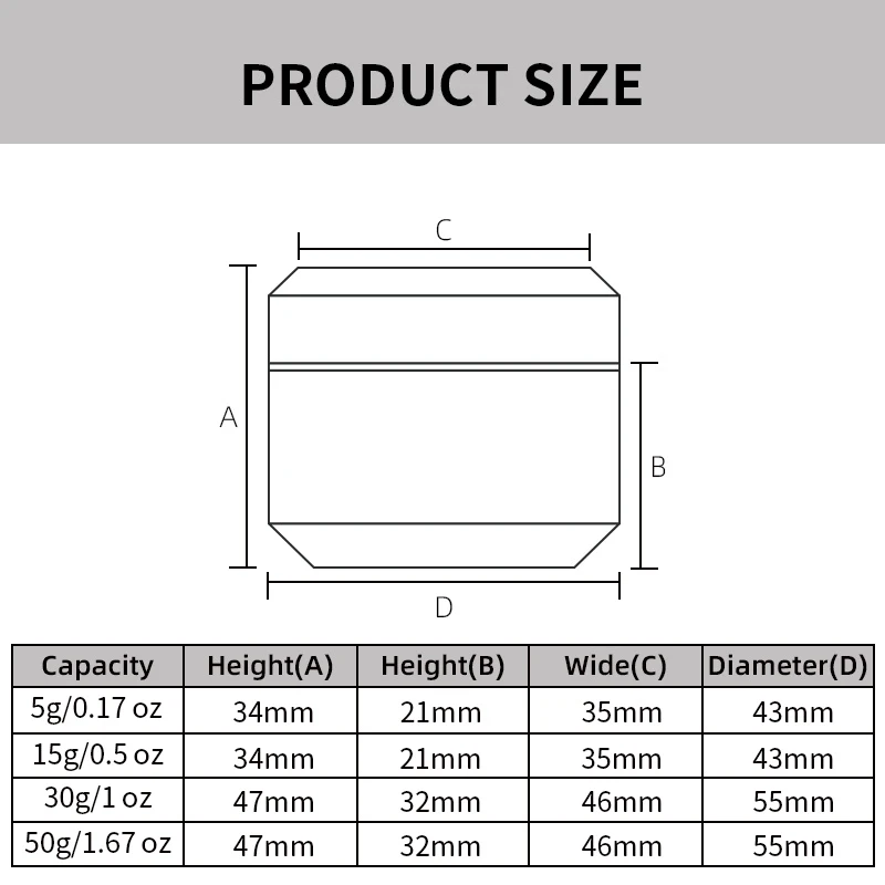 Capacity: 5g (0.17 oz), 15g (0.5 oz), 30g (1 oz), 50g (1.67 oz)