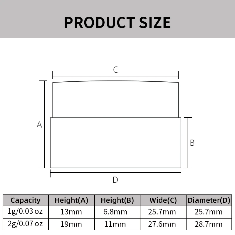 Capacity: 1g (0.03 oz), 2g (0.07 oz)