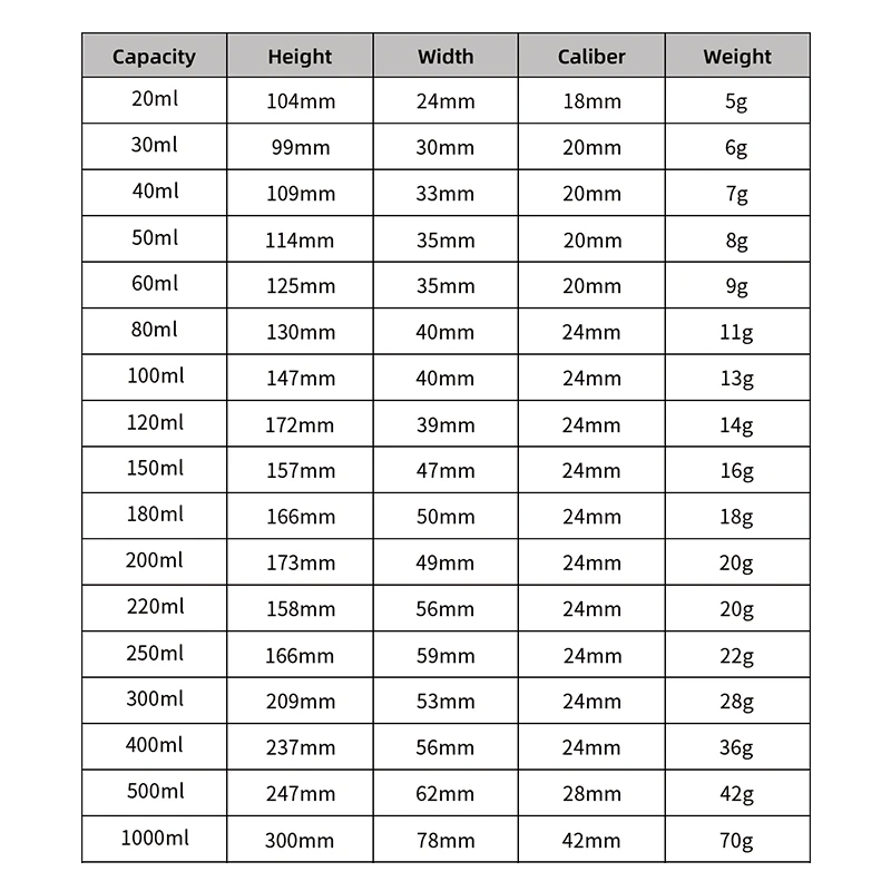 20 / 30 / 40 / 50 / 60 / 80 / 100 / 120 / 150 / 180 / 200 / 220 / 250 / 300 / 400 / 500 / 1000ml