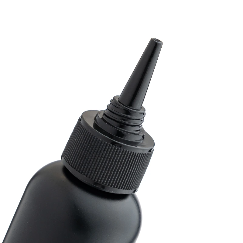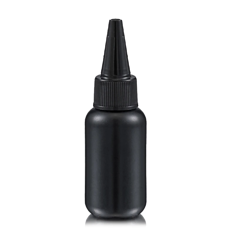 Black HDPE squeeze empty bottle with a pointed nozzle, designed for precise dispensing of liquid nail gels and adhesives.