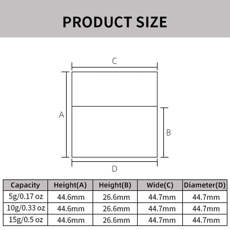 5g / 10g / 15g (0.17oz / 0.33oz / 0.5oz) – H44.6 × Ø44.7 mm