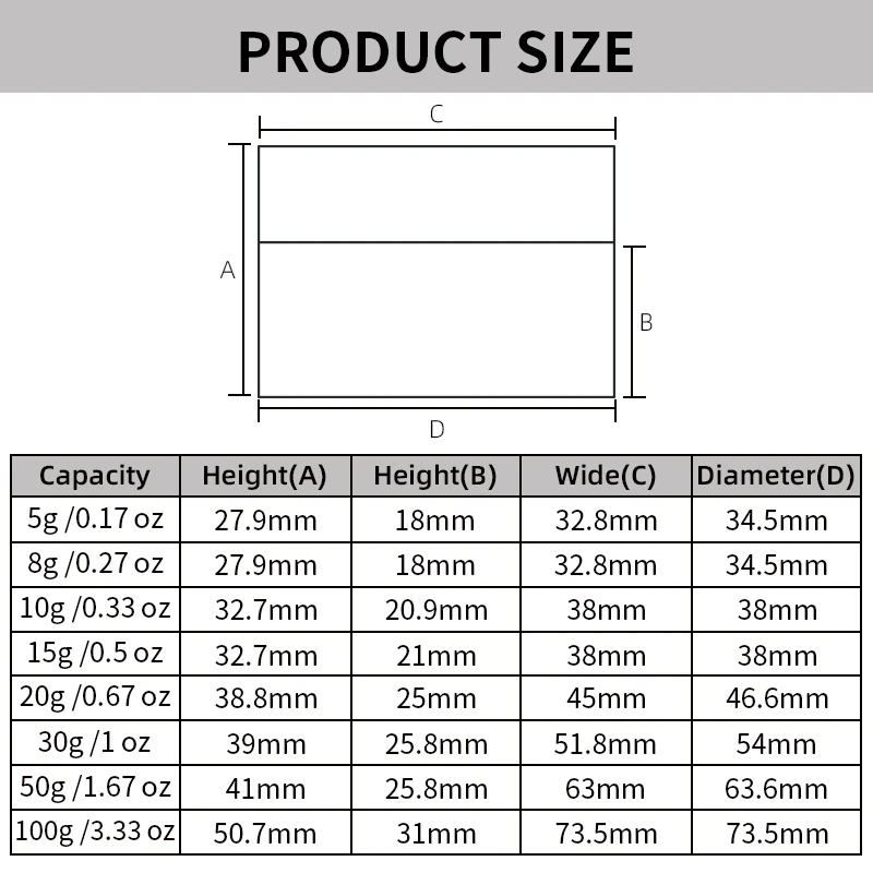 Capacity: 5g (0.17 oz), 8g (0.27 oz), 10g (0.33 oz), 15g (0.5 oz), 20g (0.67 oz), 30g (1 oz), 50g (1.67 oz), 100g (3.33 oz)
